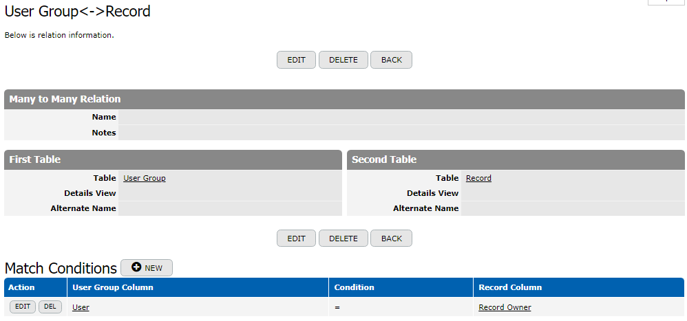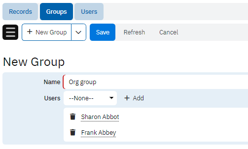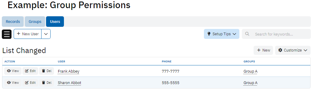 The Records table stores the records. Access to these records is granted based on the groups assignment.