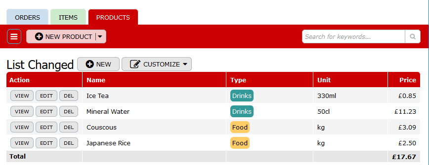 The "Products" table stores master data related to the products available for ordering. It includes columns for product name, type, unit of measurement, price, and standard fields for tracking ownership and modifications. This table serves as a centralized repository for product information, ensuring consistency and accuracy across different orders and items.