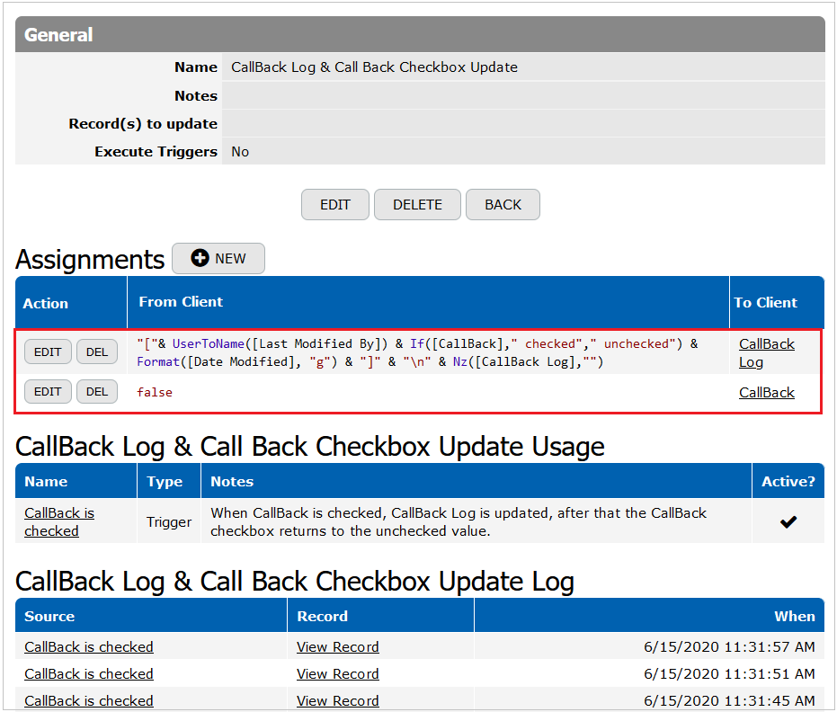 Execute Triggersoption of the action. If the action should activate other record change triggers, choose theYesoption; otherwise, theNooption is selected.