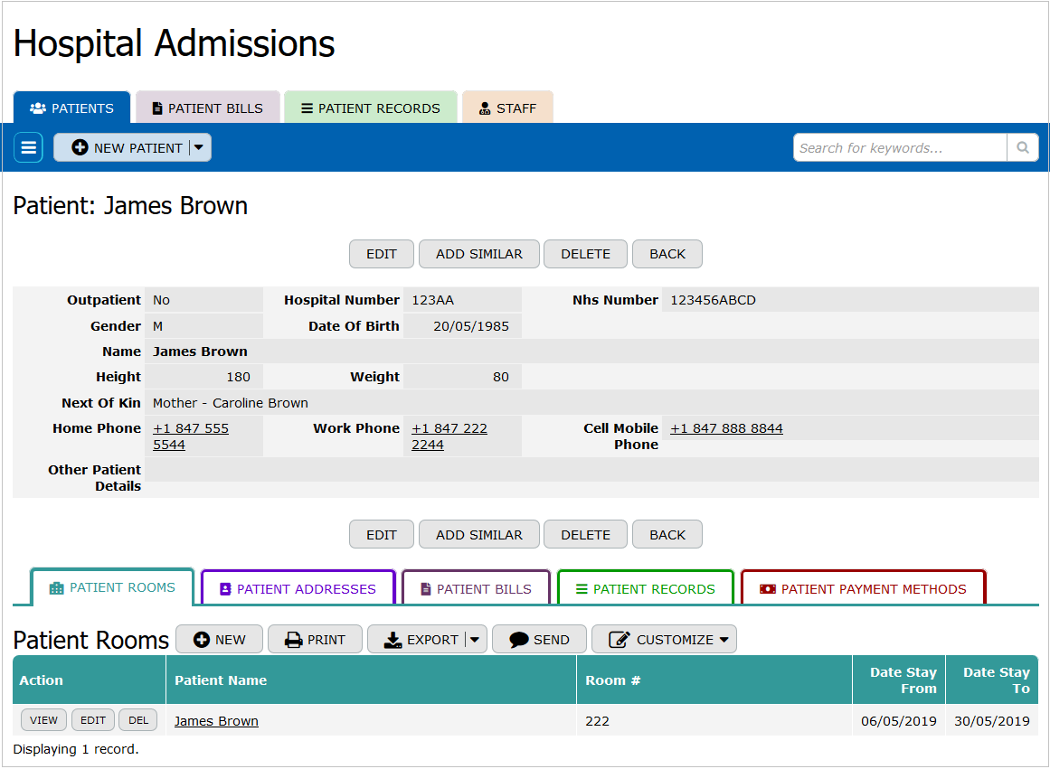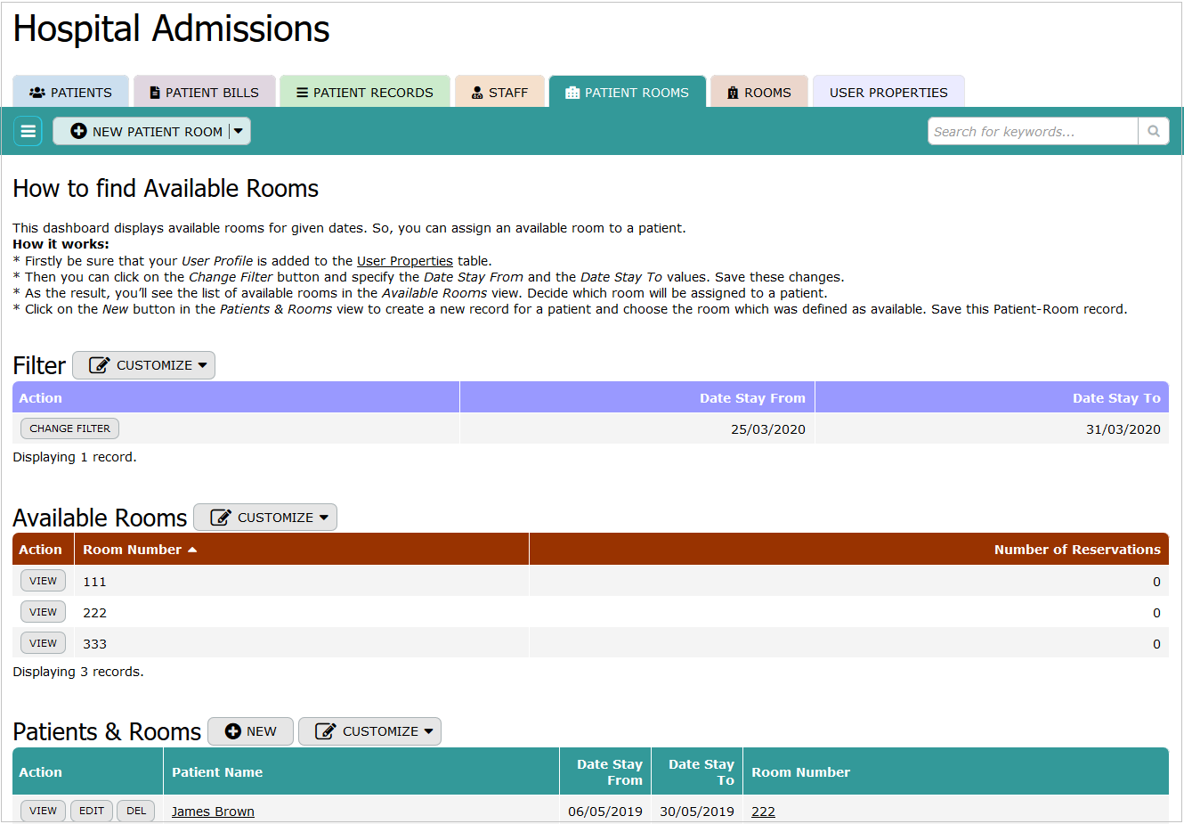 The Patient Rooms table tracks the occupancy and assignment of rooms to patients within the hospital. It records details such as the patient's name, dates of stay (from and to), room number, and standard database management fields. This table helps in managing room availability, optimizing patient accommodation, and ensuring efficient use of hospital facilities.