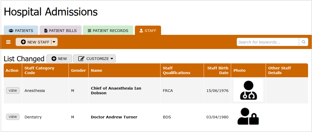 The Patient Records table houses medical and administrative records associated with each patient admission. It includes fields such as billable item code, component code, staff names involved in updating records, admission date and time, medical conditions, and detailed patient record component information. This table supports comprehensive documentation of patient care, aiding healthcare providers in delivering informed and coordinated treatment.