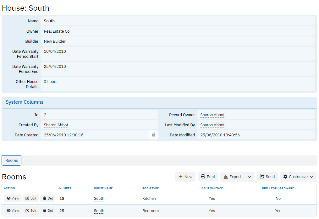 The Rooms table tracks the different rooms within each house. It stores information like the room number, the house it belongs to, and room-specific details such as the type of room, light valence, and whether the room is pre-drilled for hardware installation. This table is essential for organizing and identifying rooms within a house.