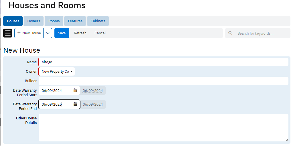 The Houses table serves as the main repository of information about each house, including details such as the name of the house, its owner, the builder, and the warranty period. This table is crucial for tracking ownership and warranty dates, which are important for long-term property management.