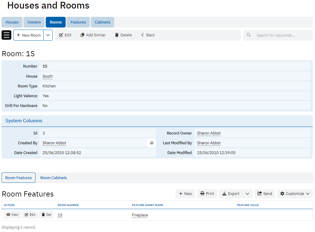 The Features table catalogs various room features, including both short and long names, a description, and the value type for each feature. This table provides the foundation for defining what features are available for rooms, making it easy to assign specific attributes to individual spaces.