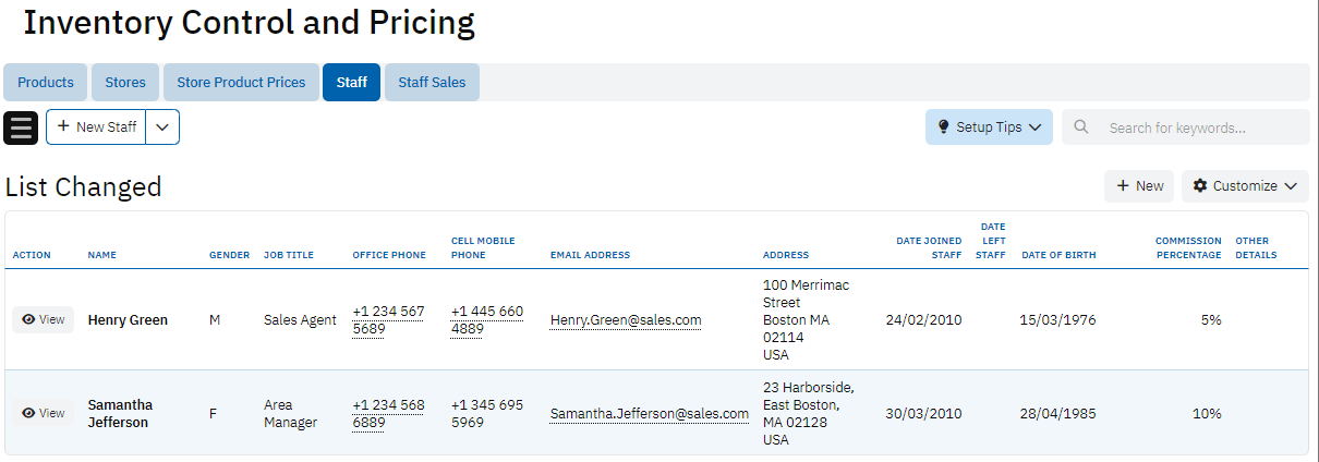 The Staff table provides a detailed record of store employees. It contains personal information such as the staff member’s name, job title, contact details, date of birth, and commission percentage. This table is essential for managing human resources, including tracking when staff members join or leave the company.