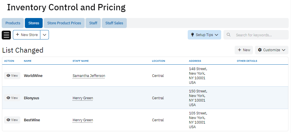 The Stores table records information about different store locations, including the store name, manager, staff details, and location and address. It serves as a directory for managing the various stores within the system, connecting them with specific products and staff members.