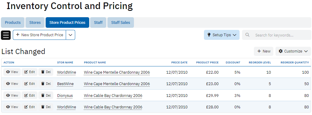 The Store Product Prices table connects products to individual stores, allowing for store-specific pricing and stock management. It tracks the store name, product name, product price, discounts, reorder levels, and reorder quantities, helping store managers adjust prices and ensure timely product restocking.