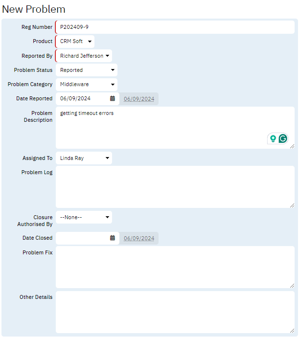 The Assigned To and Assigned To Name fields indicate the staff member responsible for addressing the problem. The Problem Log records updates and actions taken throughout the problem's lifecycle. Closure Authorised By and Closure Authorised By Name are used to document who authorized the closure of the problem, with Date Closed and Problem Fix capturing the resolution details. The Other Details field provides any additional relevant information.