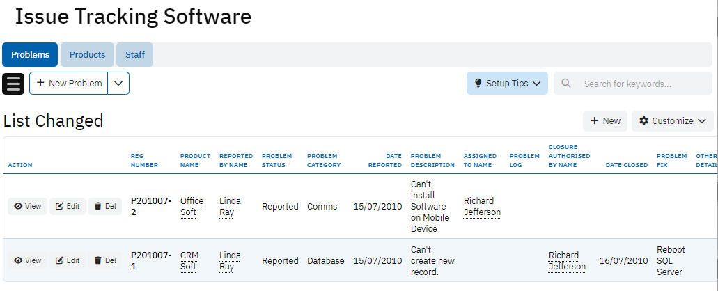 Together, these tables enable a structured approach to tracking and resolving issues, ensuring that problems are efficiently managed and that relevant staff members are appropriately assigned and informed.