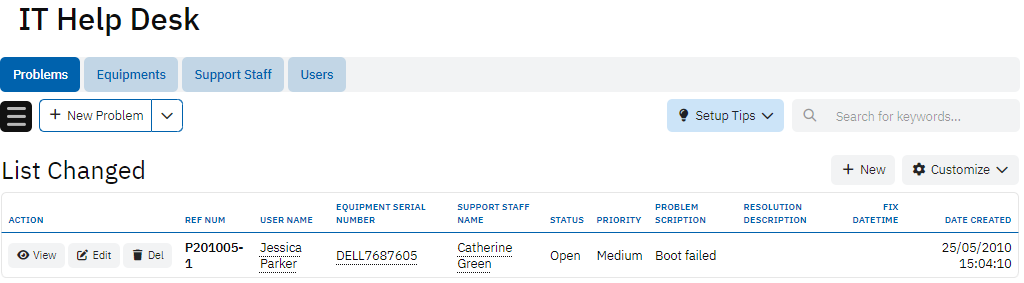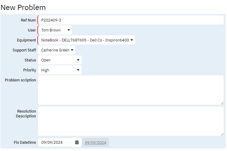 The Problems table serves as the primary repository for logging help desk issues. Each record includes a Ref Num that uniquely identifies the problem, along with details such as the User and User Name who reported the issue, the Equipment involved, and the assigned Support Staff. Fields like Status, Priority, and Problem Description provide context about the severity of the issue and its current state. Once the issue is resolved, the Resolution Description and Fix Datetime fields document how and when the problem was fixed, creating a complete history of the incident.