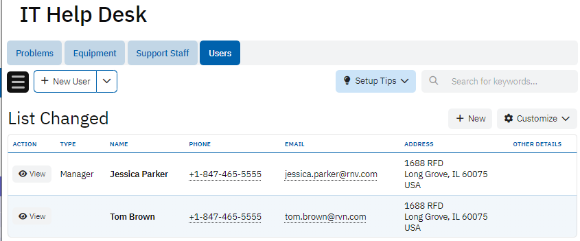 The Users table stores information about the individuals who interact with the IT help desk. Each record includes the Name, Phone, and Email of the user, along with additional details like their Address and user-specific Type, which may categorize users by department or level of access.