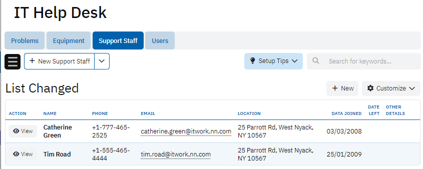 The Support Staff table details the employees responsible for resolving technical issues. It includes essential contact information such as Phone, Email, and Location, as well as employment dates (Date Joined, Date Left) to track active support personnel.