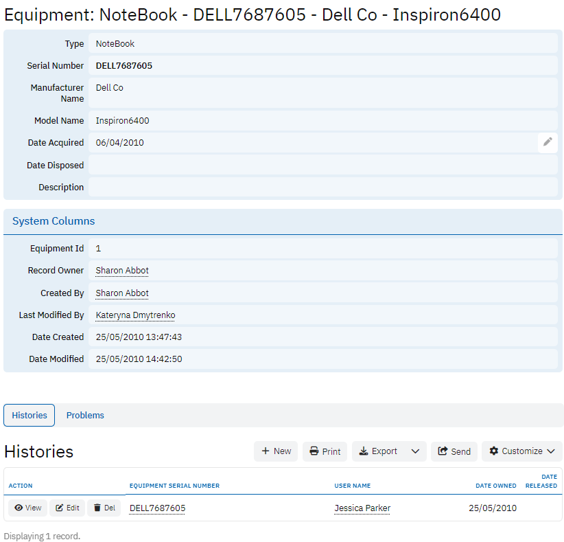 The Histories table provides a log of equipment ownership over time, linking Equipment Serial Number with the User Name and dates for when the equipment was Date Owned and Date Released. This table allows for tracing which users had access to particular pieces of equipment at different times.