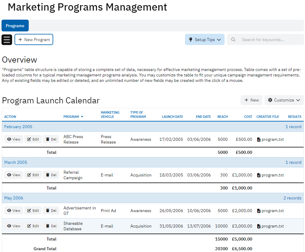In summary, the Marketing Programs Management database is a vital tool for organizing and analyzing marketing initiatives, ensuring that campaigns are executed efficiently and deliver measurable results.