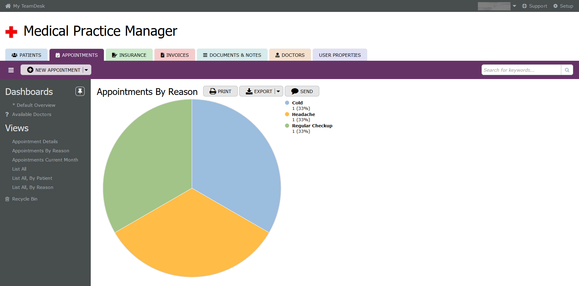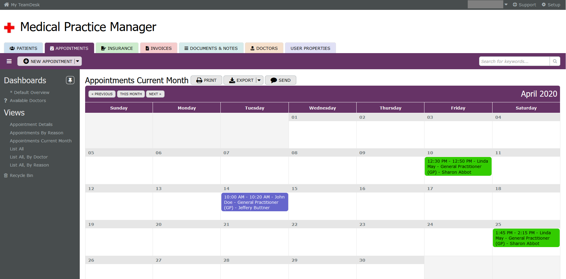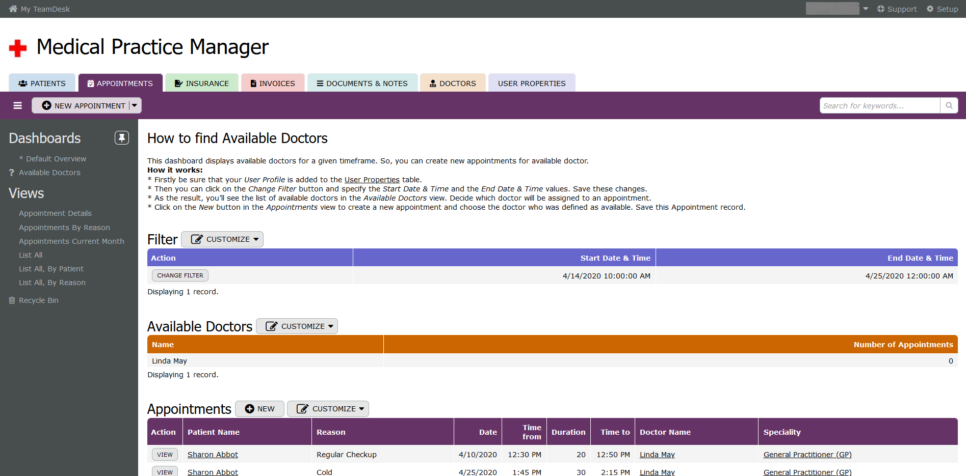 | Preconfigured web-based database for insurance companies / insurance carriers. This app allows the storage and management of information about claims, patients, staff (e.g. claims processor, manager), claim processing stages and dispute areas. Customizable workflow. | This online app provides practicing doctors with a centralized searchable environment to store and manage records about medical staff, patients, appointments and medications. Customizable workflow. |