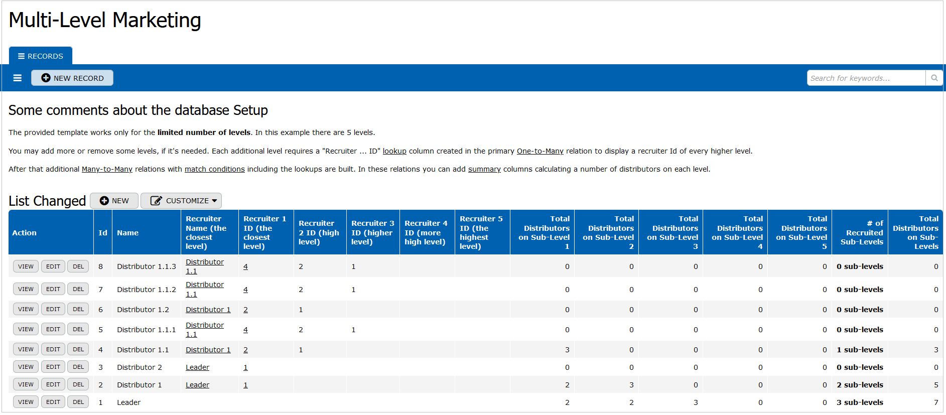 Records: This table serves as the core of the database, capturing essential information about each distributor or participant within the MLM network. Fields include an ID for unique identification, name of the distributor, and multiple columns for recording the IDs of up to five recruiters at different levels. The table also tracks ownership and modification details. Additionally, it records the total number of distributors recruited at various sub-levels and provides a count of total distributors across these levels. This structure enables the organization to visualize and analyze the network's growth and structure over time.