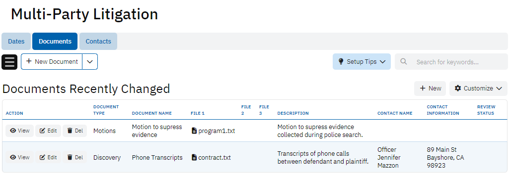 The Documents table stores all necessary legal files for the litigation. It includes details like Document Type (e.g., legal brief, evidence), Document Name, and the ability to upload up to three files. The table also stores a Review Status and provides contact information for relevant individuals, ensuring smooth communication about document handling and review.