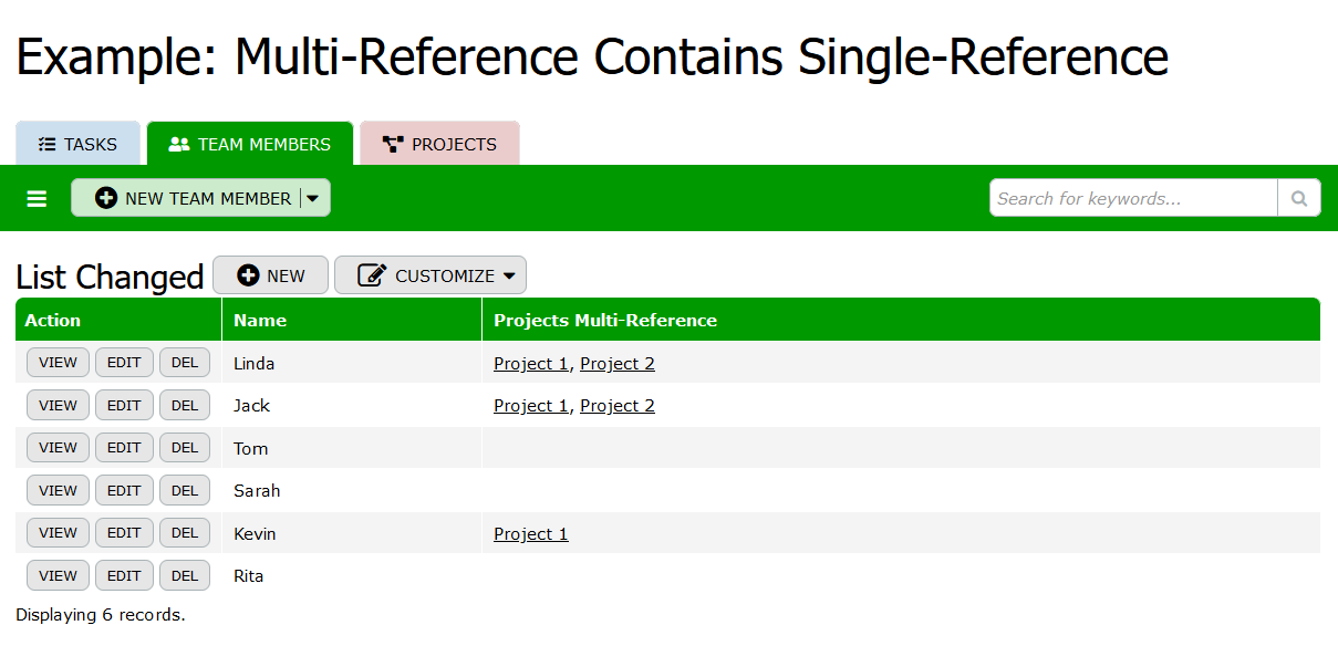 The "Team Members" table stores details about individual team members involved in the organization's projects. It includes columns like Name to identify team members uniquely, along with standard metadata fields for managing records. Additionally, it may include a multi-reference column (Projects Multi-Reference) to indicate the projects each team member is involved in, facilitating efficient assignment, collaboration, and tracking of responsibilities across multiple projects.