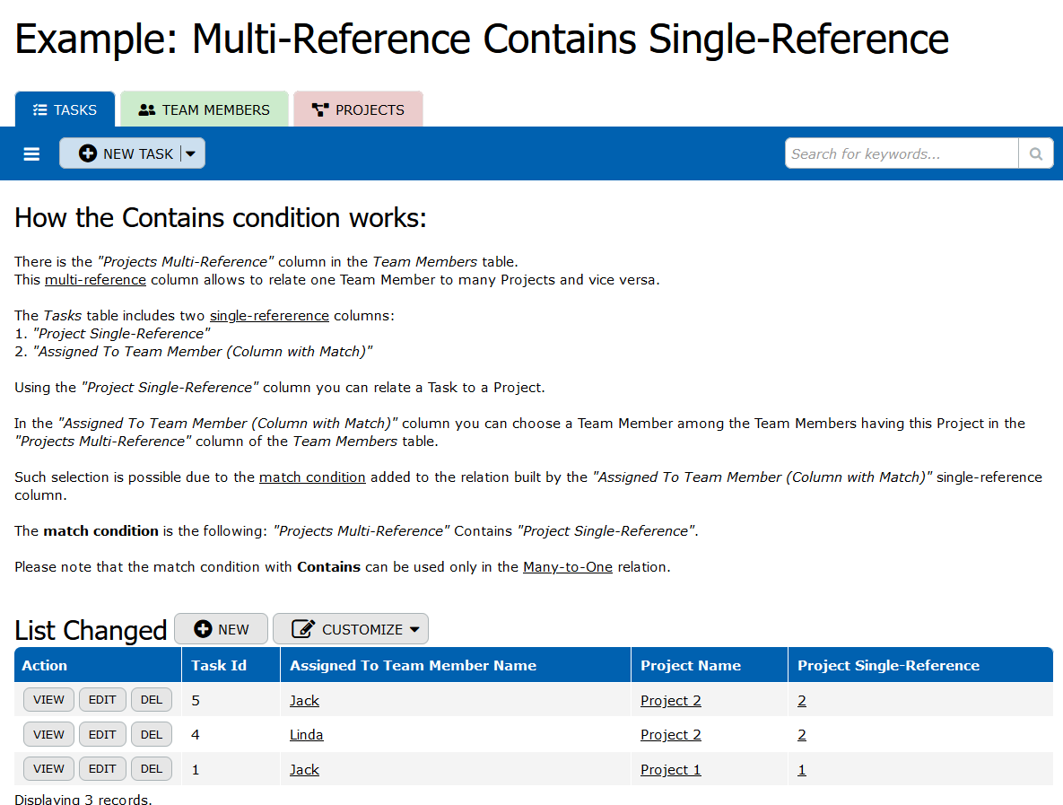 The "Team Members & Projects" table establishes the many-to-many relationship between team members and projects. It includes columns like Team Member and Project to denote the associations between team members and the projects they participate in. This table enables efficient querying and reporting on team assignments, project involvements, and overall project management.
