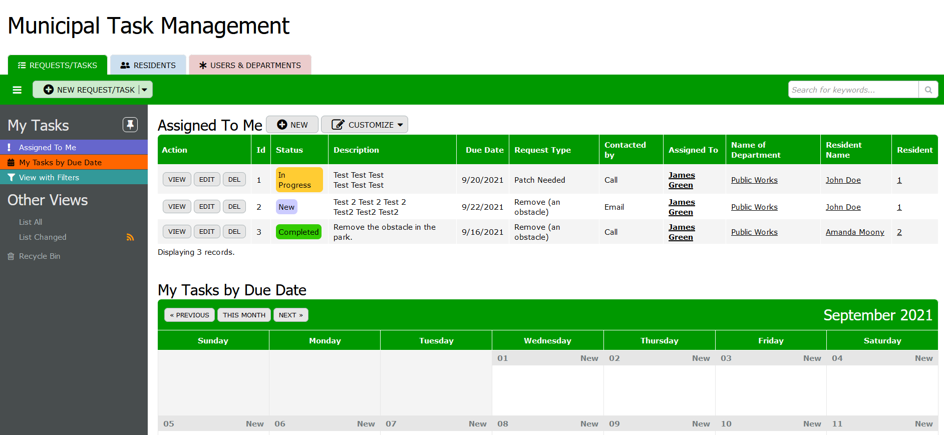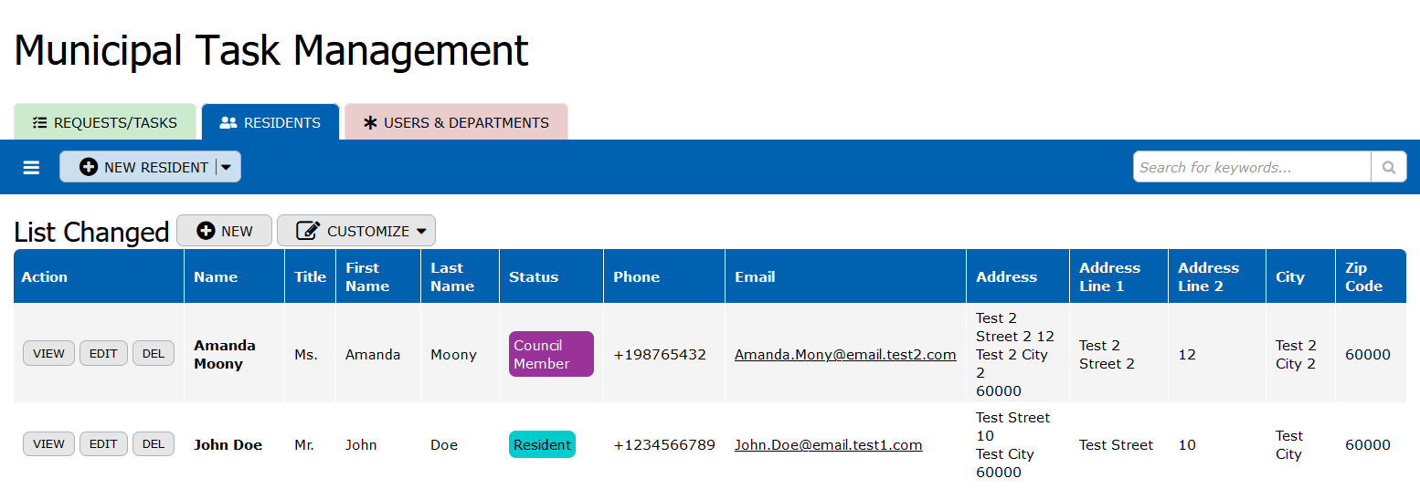 Residents: This table stores information about residents within the municipality. Fields include resident details such as name, title, first name, last name, status, contact information (phone, email), and address details (address lines, city, zip code). The table provides a comprehensive view of residents served by the municipality, enabling efficient communication and engagement regarding tasks and requests submitted.