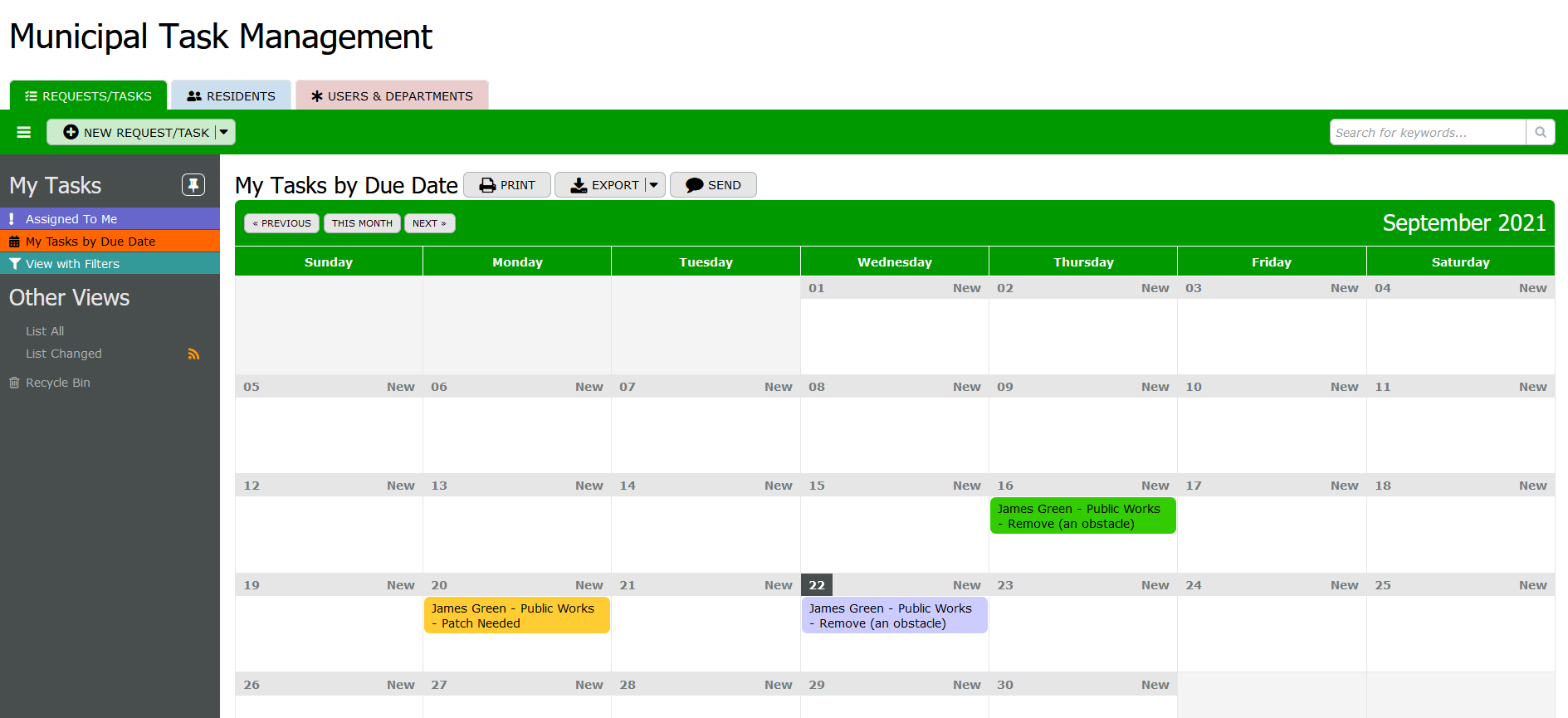 Requests/Tasks: This table serves as the central repository for all tasks and requests submitted to the municipality. It includes fields such as ID for unique identification, status of the task (e.g., pending, in progress, completed), detailed description of the task or request, due date for completion, type of request, contact information of the requester, assignment to specific departments or individuals, resident's name associated with the request, and timestamps for creation and last modification. These attributes allow municipal staff to manage and prioritize tasks effectively, ensuring timely responses to resident needs and efficient allocation of resources across departments.