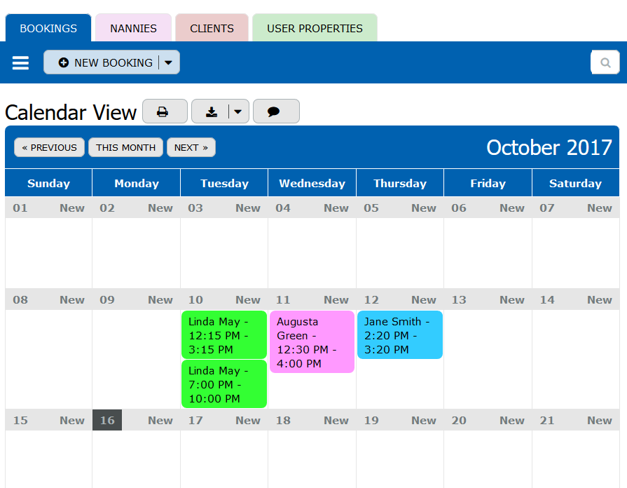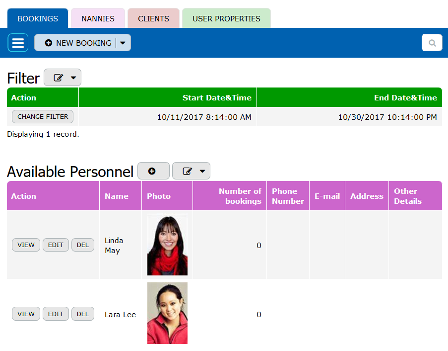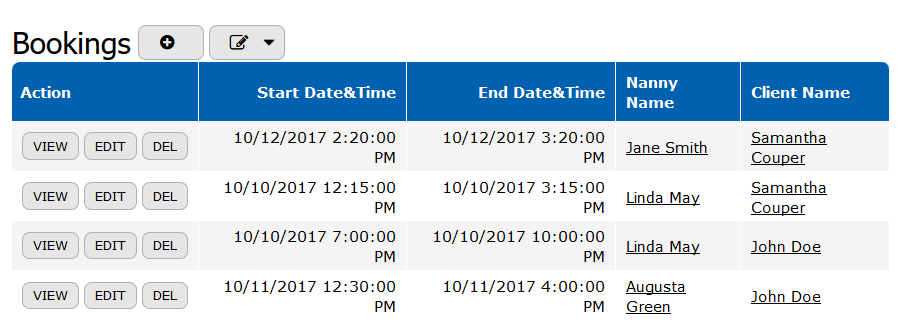 The "Bookings" table serves as the core component for managing nanny bookings. It includes fields such as the booking's registered number, start date and time, end date and time, assigned nanny's name, client's name, and other relevant details. This table helps the agency track scheduled appointments, ensure timely service delivery, and maintain a record of past and upcoming engagements between nannies and clients.