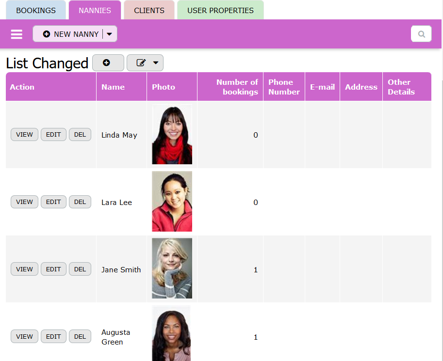 The "Nannies" table contains comprehensive information about individual nannies registered with the agency. It includes details such as the nanny's name, photo, contact information (phone number, email, address), number of bookings handled, and additional notes or specific details relevant to their service. This table enables the agency to manage their roster of nannies effectively, ensuring that client needs are matched with qualified caregivers.