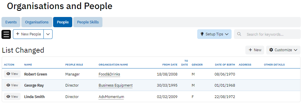 The People table focuses on individuals associated with various organizations. It captures details such as First Name, Last Name, People Role, and the specific Organisation Name they are linked to. Additional information like Gender, Date of Birth, and Address helps provide a fuller profile of each person, making it easier to understand their role within the organization.
