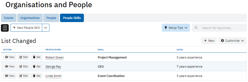 The People Skills table tracks the skills of individuals. It records the person’s name, the Skill they possess, and their Level of expertise. This table is especially useful for identifying key skills within an organization and for matching individuals to roles or projects that require specific expertise.