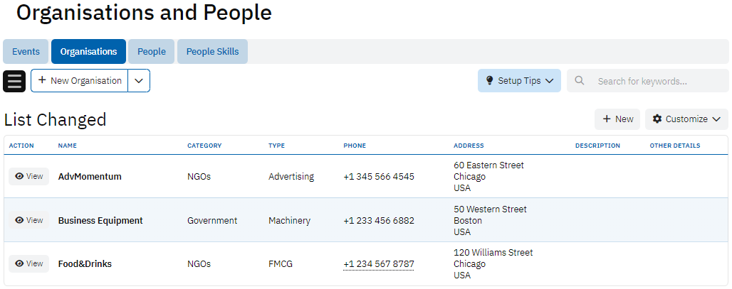 The Organisations table provides detailed information about each organization. It includes fields such as Category, Type, and Description, along with the organization’s contact information like Phone and Address. This table serves as a central repository for all key details about the organizations involved in the database.