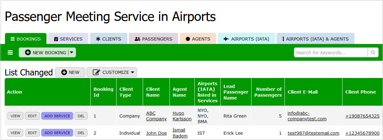 Bookings: This table contains detailed information about each booking made for the passenger meeting service. It includes the booking ID, client type, client name, agent name, the airports involved, lead passenger name, number of passengers, client contact details, payment terms, confirmation status, and timestamps for creation and modification. By keeping track of these details, the service can ensure that all bookings are handled smoothly and accurately, providing passengers with a seamless experience.