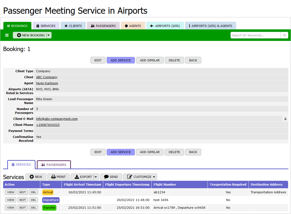 Services: This table records specific services related to each booking. It captures details such as the type of service, associated airport and agent, flight arrival and departure information (including dates, times, and flight numbers), transportation requirements, destination address, terminal, meeting point address, and any additional notes or attachments. These details help coordinate the logistics of meeting passengers at the airport and providing the necessary services.