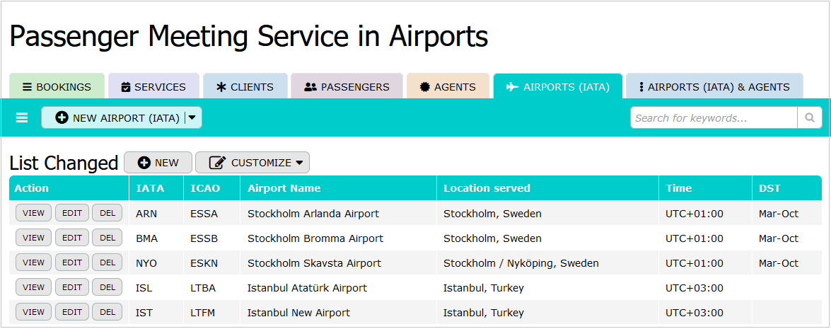 Airports (IATA): This table contains information about the airports involved in the service. It includes airport ID, IATA and ICAO codes, airport name, location served, time, and daylight saving time (DST) details. Having accurate and up-to-date airport information is essential for coordinating services and ensuring timely assistance for passengers.