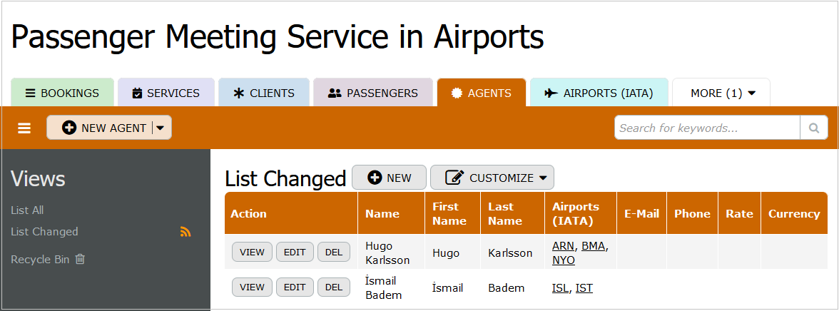 Agents: This table records details of agents who facilitate the passenger meeting service at various airports. It includes agent ID, name, contact details, the airports they serve, and their rates and currencies. This information is crucial for coordinating services and ensuring that the appropriate agent is assigned to each booking.