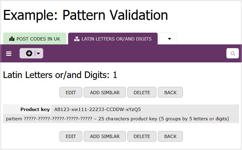 Together, these tables provide a structured approach to managing and validating data entries based on specific patterns (such as postal codes, numeric formats, and alphanumeric keys) within the database. They support various applications requiring accurate data validation, compliance with standards, and effective management of structured data.
