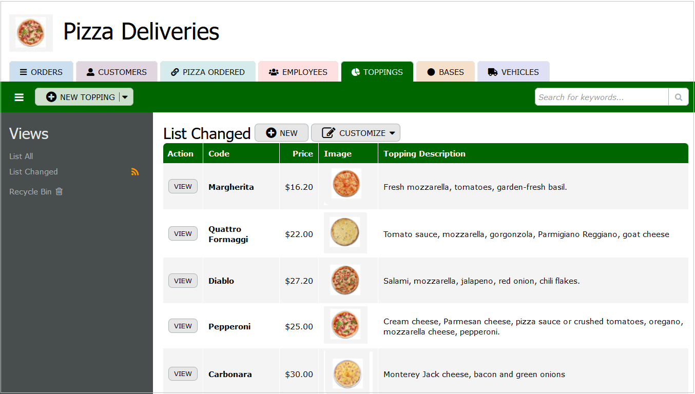 The "Toppings" table lists all available pizza toppings along with their prices, codes, and descriptions. This table ensures that every topping is properly accounted for and priced, contributing to accurate billing and inventory management.