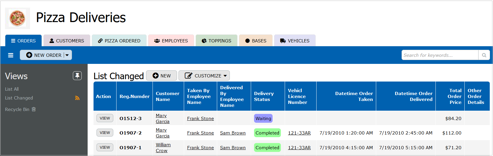 The "Orders" table keeps a detailed record of each pizza order placed. It includes information about the customer, the employees who took and delivered the order, the delivery status, and details about the vehicle used for delivery. Key timestamps such as when the order was taken and delivered are also recorded, along with the total price and any other relevant order details.