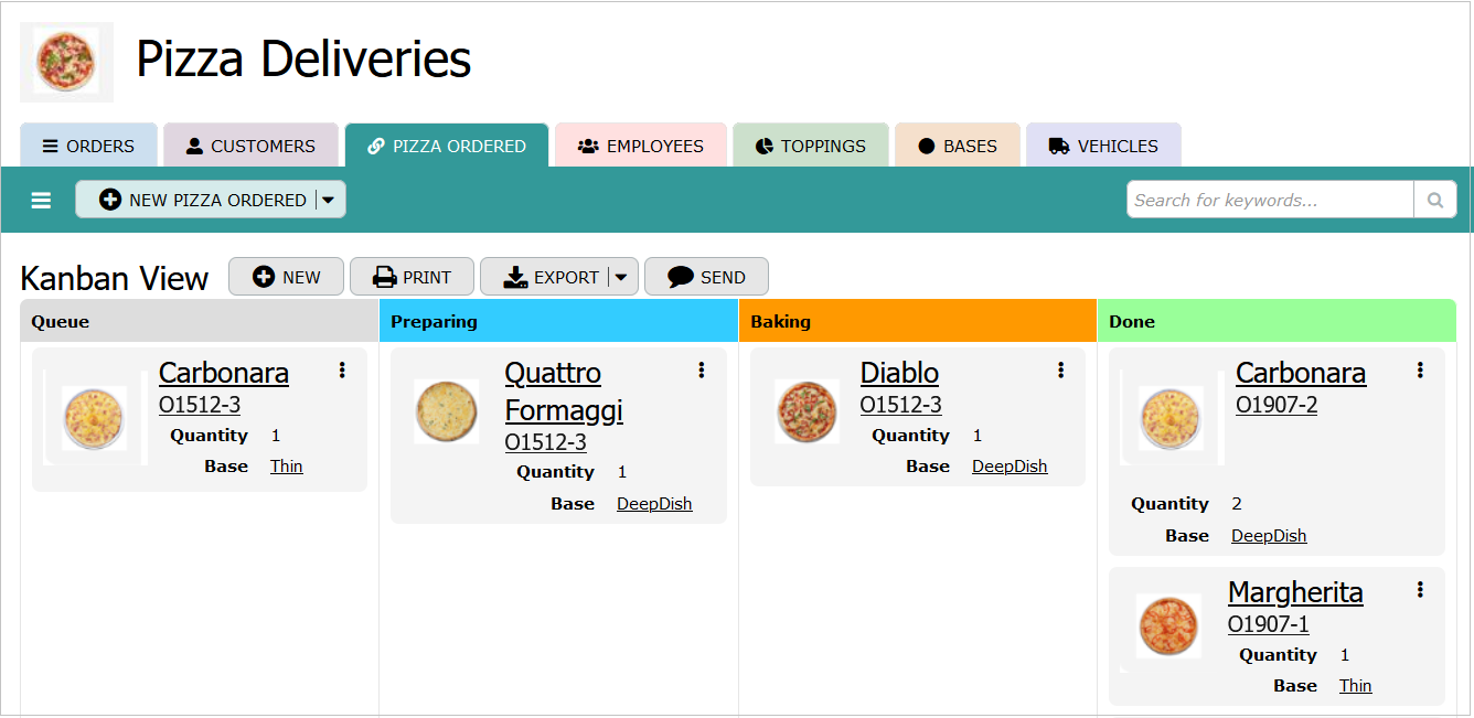 The "Pizza Ordered" table provides specific details about each pizza in an order. It includes the status, an image of the pizza, the topping code, base price, topping price, quantity, and total price of the pizza. This table links to the order it belongs to, as well as to the specific base and toppings used, facilitating accurate tracking of ingredients and pricing.