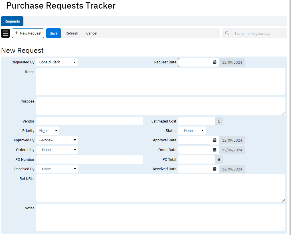 The Requests table is the central hub of this database, capturing all relevant information for each purchase request. This includes the Request Date, the individual Requested By, the Items being requested, and the Purpose behind the purchase. The table also tracks key details like the Vendor, Estimated Cost, and Priority of the request, ensuring that high-priority needs are addressed first. Additionally, the table logs the Status of the request, along with information about who Approved the request and when it was Approved, ensuring proper authorization. Once the purchase is approved, it records details like the Order Date, PO Number, PO Total, and who Received the items, ensuring full visibility from start to finish.