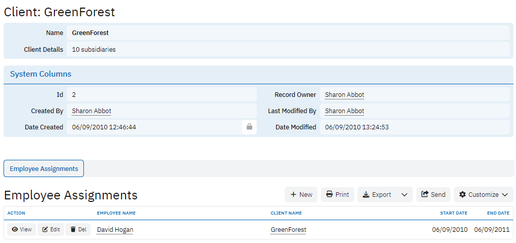 The Employee Assignments table tracks which employees are assigned to which clients. The fields Employee Name, Client Name, and assignment Start Date and End Date allow for efficient scheduling and tracking of guard deployment, ensuring that the right personnel are assigned to the right clients at the appropriate times.
