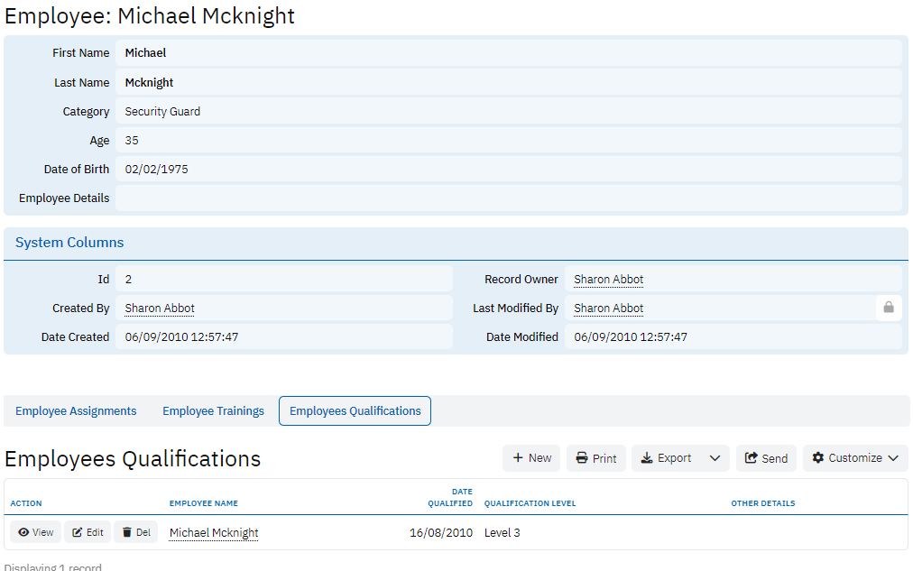 The Employees Qualifications table tracks the qualifications obtained by the security personnel. It includes fields like Date Qualified and Qualification Level, which help in verifying the guards’ credentials and determining their suitability for particular roles or assignments.