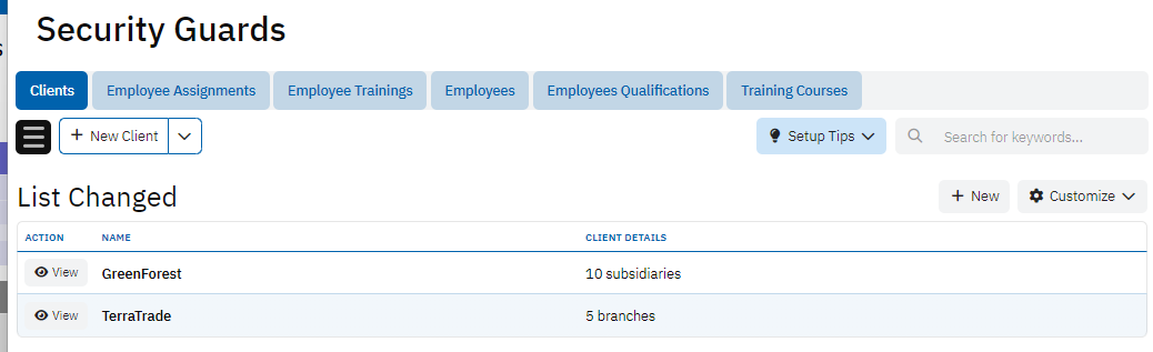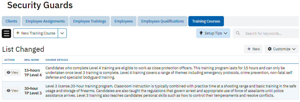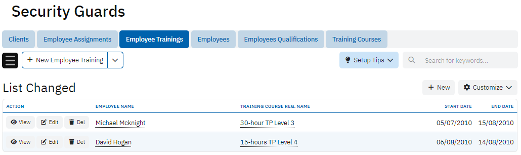 The Employee Trainings table monitors the training progress of security personnel. This table includes the Employee Name, Training Course Reg. Name, and the training Start Date and End Date, providing a record of each guard’s training history, ensuring that they meet the required standards for their assignments.