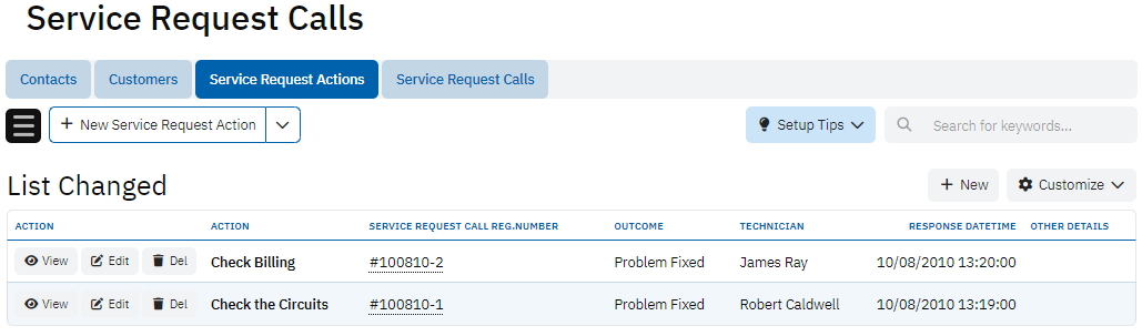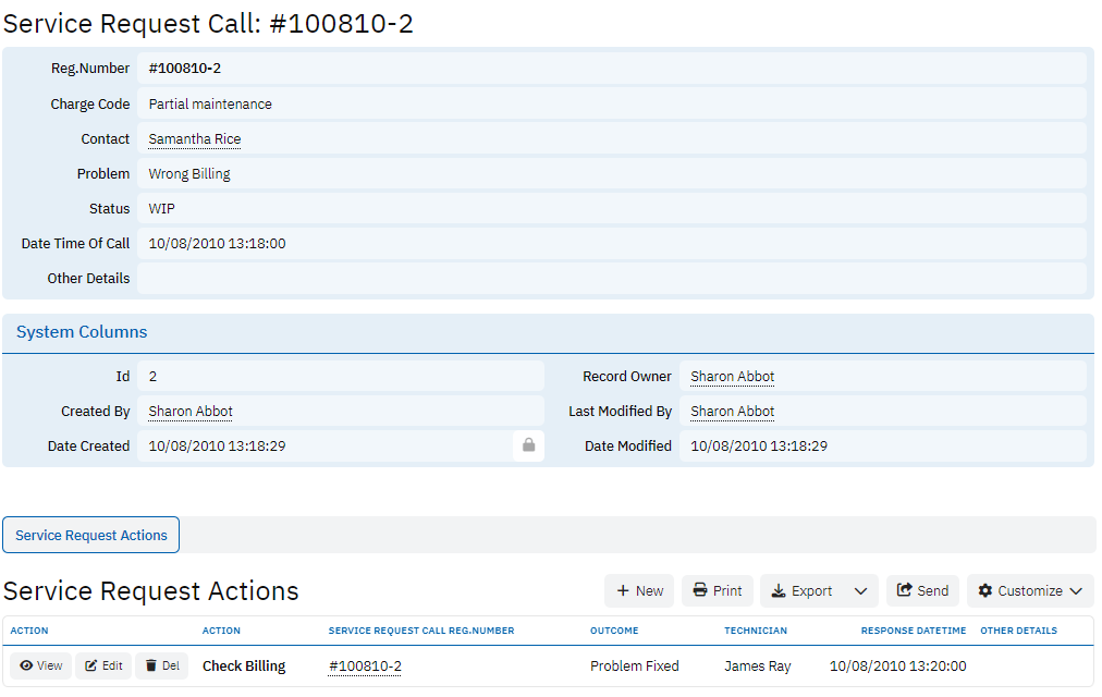 The Service Request Actions table tracks the steps taken to address each service request. It includes fields like Action, Service Request Call Reg. Number, Outcome, and Technician, which record the actions performed by technicians, the results of those actions, and the timing of each response. This table helps ensure accountability and provides a timeline of service activities.