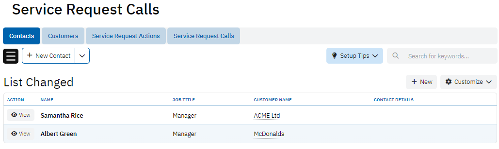 The Contacts table stores information about the people associated with the service requests. It includes fields like Name, Job Title, Customer Name, and Contact Details, providing a clear view of who is involved in each request. This table helps to identify the key contacts for follow-ups and communication-related to service issues.