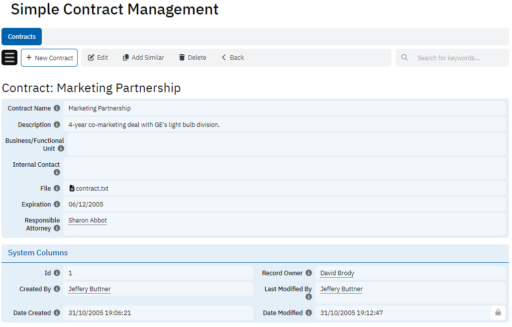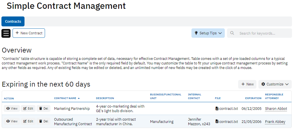 The Contracts table is the core of this database. It stores essential information about each contract, such as the Contract Name, a Description of the agreement, and the Business/Functional Unit responsible for it. It also includes fields for the Internal Contact managing the contract and the Responsible Attorney overseeing legal matters. Other key fields, such as File (for storing the contract document), Expiration (for tracking contract deadlines), and Id (for unique identification), ensure that all contracts are properly recorded and monitored from creation to their expiration.