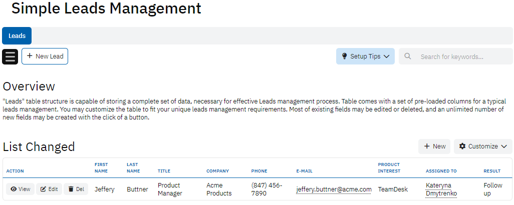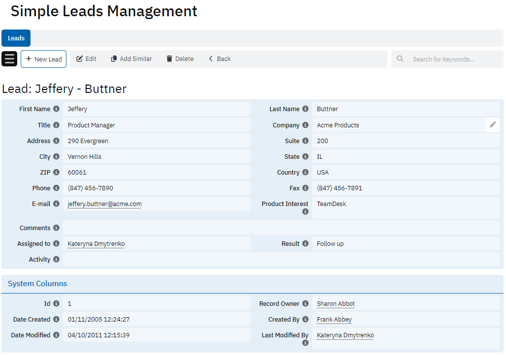 In terms of sales specifics, the Product Interest field allows users to capture which products or services the lead is interested in, while Comments can provide additional context or notes. The Assigned to field indicates which team member is responsible for following up with the lead, and the Result and Activity fields help track the outcomes and actions taken with respect to each lead. This structure ensures that leads are effectively managed, and all relevant information is stored for future reference and reporting.