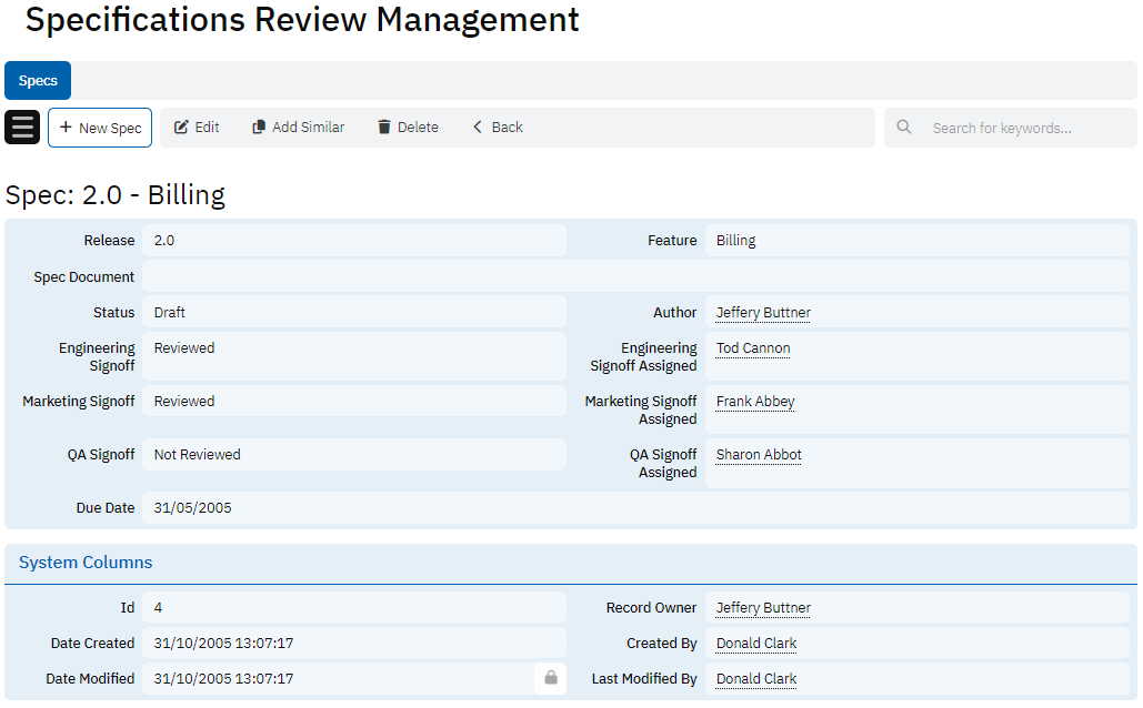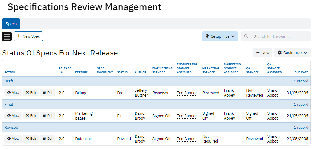 Each specification has several signoff stages: Engineering Signoff, Marketing Signoff, and QA Signoff, with corresponding fields for the person assigned to each signoff (Engineering Signoff Assigned, Marketing Signoff Assigned, and QA Signoff Assigned). The Due Date ensures that deadlines are tracked, and the database captures who is responsible for authoring the document under the Author field.