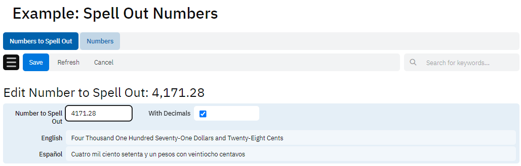 The "Example: Spell Out Numbers" database is designed to convert numerical values into their written form in both English and Spanish. This system is particularly useful for generating the spelled-out versions of numbers for documents, financial statements, and other formal contexts where numbers need to be presented in text form. The database is structured to handle complex numbers, including those with decimals, and provides a clear breakdown of each component of the number.