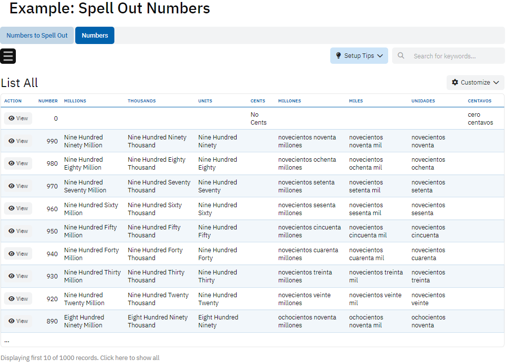 The Numbers to Spell Out table is the main table where users input a numerical value that they want to spell out. It breaks down the number into its components—millions, thousands, units, and cents—and then converts each part into its corresponding text in both English and Spanish. This table is essential for users who need a detailed and accurate text representation of numbers, whether for legal, financial, or administrative purposes. The table also includes fields for special messages and options to handle numbers with decimals, ensuring flexibility and precision in the output.