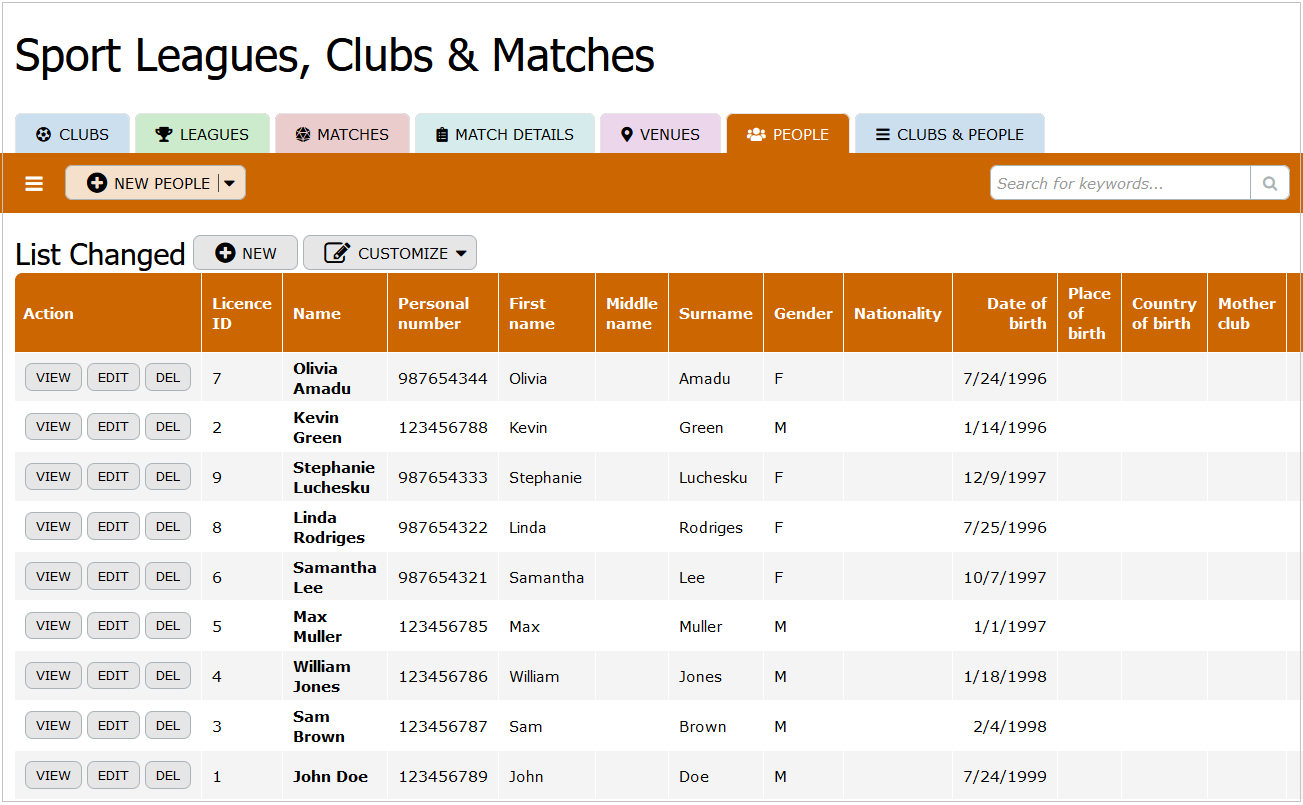 The Clubs & People table links players with their respective clubs, detailing the start and end dates of their affiliations. This table helps in tracking player movements between clubs and managing club rosters.